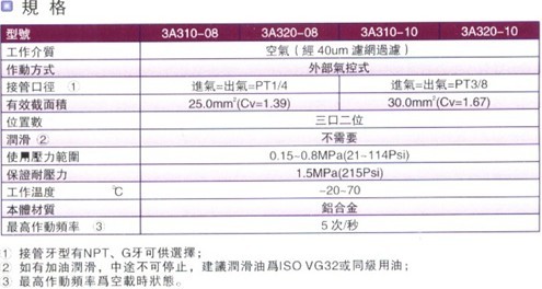 臺(tái)灣3A310-08氣控閥樣本,3A320-08換向閥參數(shù),3A310-10氣控?fù)Q向閥,3A320-10控制閥。以下是產(chǎn)品特性