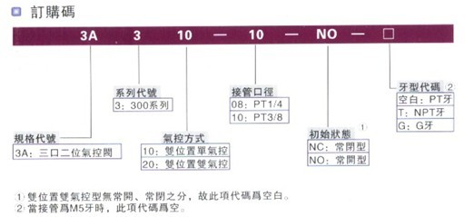臺(tái)灣AIRTAC二位三通氣控閥3A310和3A320氣控?fù)Q向閥的訂購(gòu)代碼: