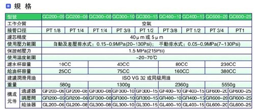 臺(tái)灣AIRTAC氣源處理元件——GC系列三聯(lián)件過濾調(diào)壓系統(tǒng)的產(chǎn)品規(guī)格表如下: