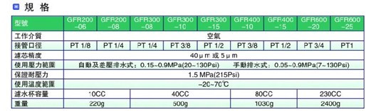 2. AIRTAC過濾調(diào)壓器GFR系列產(chǎn)品的規(guī)格表: