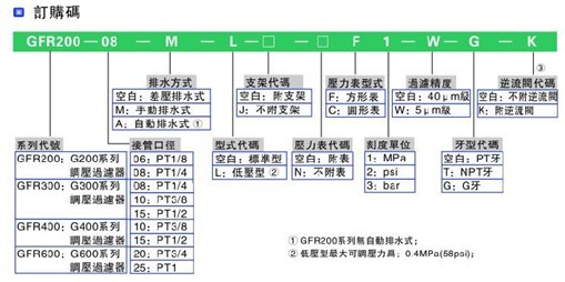 3. AIRTAC過濾調(diào)壓器GFR200調(diào)壓器,GFR300過濾調(diào)壓器,GFR400過濾調(diào)壓閥,GFR600調(diào)壓過濾器的訂購代碼: