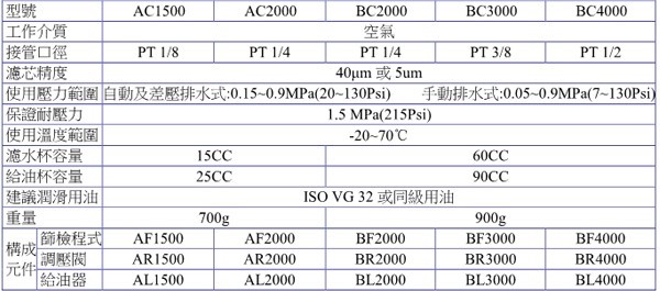 AC和BC系列三聯(lián)件產(chǎn)品規(guī)格參數(shù)表如下: