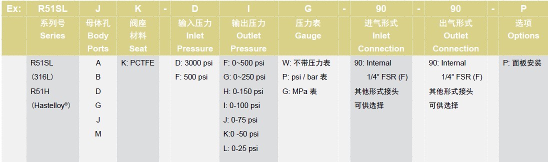 R51不繡鋼減壓器的材質 1.母體:316L (EP),可選 C22 哈氏合金 2.閥座:PCTFE 3.膜片:C22 哈氏合金 4.閥桿:C22 哈氏合金