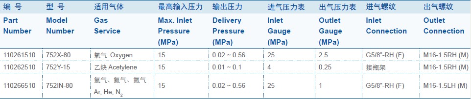 GENTEC 752系列普通型減壓器的型號有: 752X-80氧氣減壓閥;752Y-15乙炔減壓器;752IN-80氮氣氬氣氦氣用減壓器;