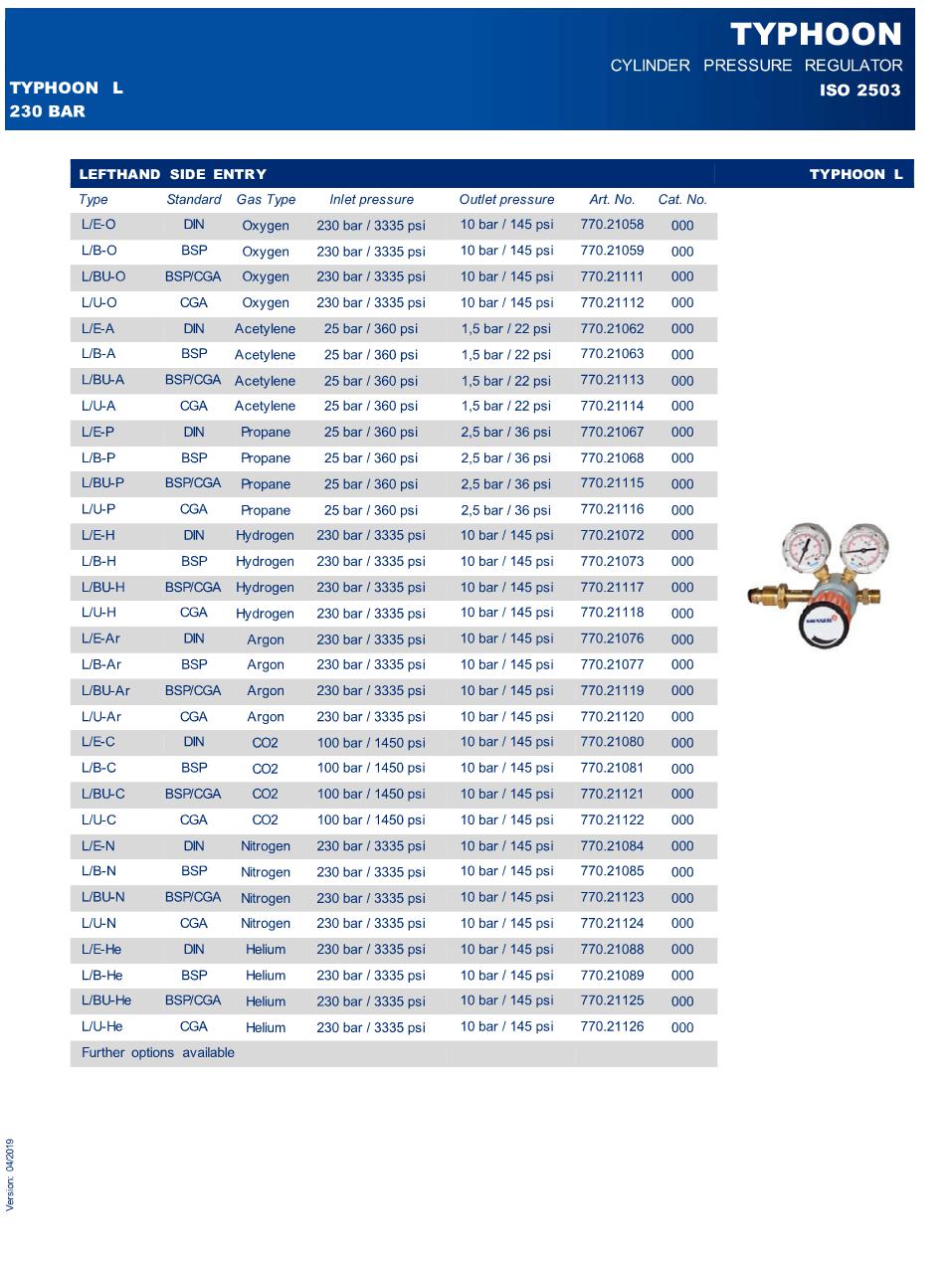 TYPHOON L減壓閥技術(shù)規(guī)格表: